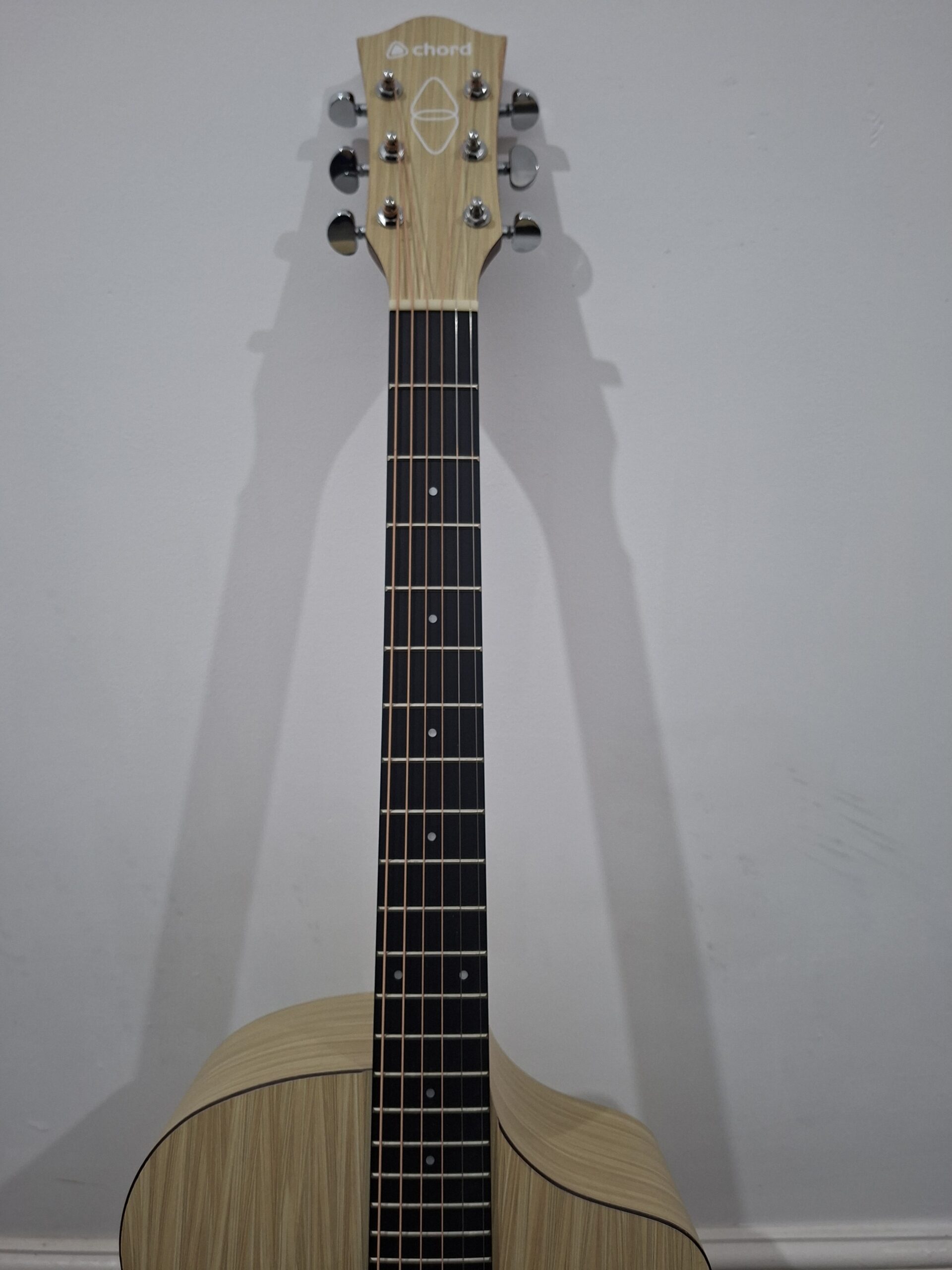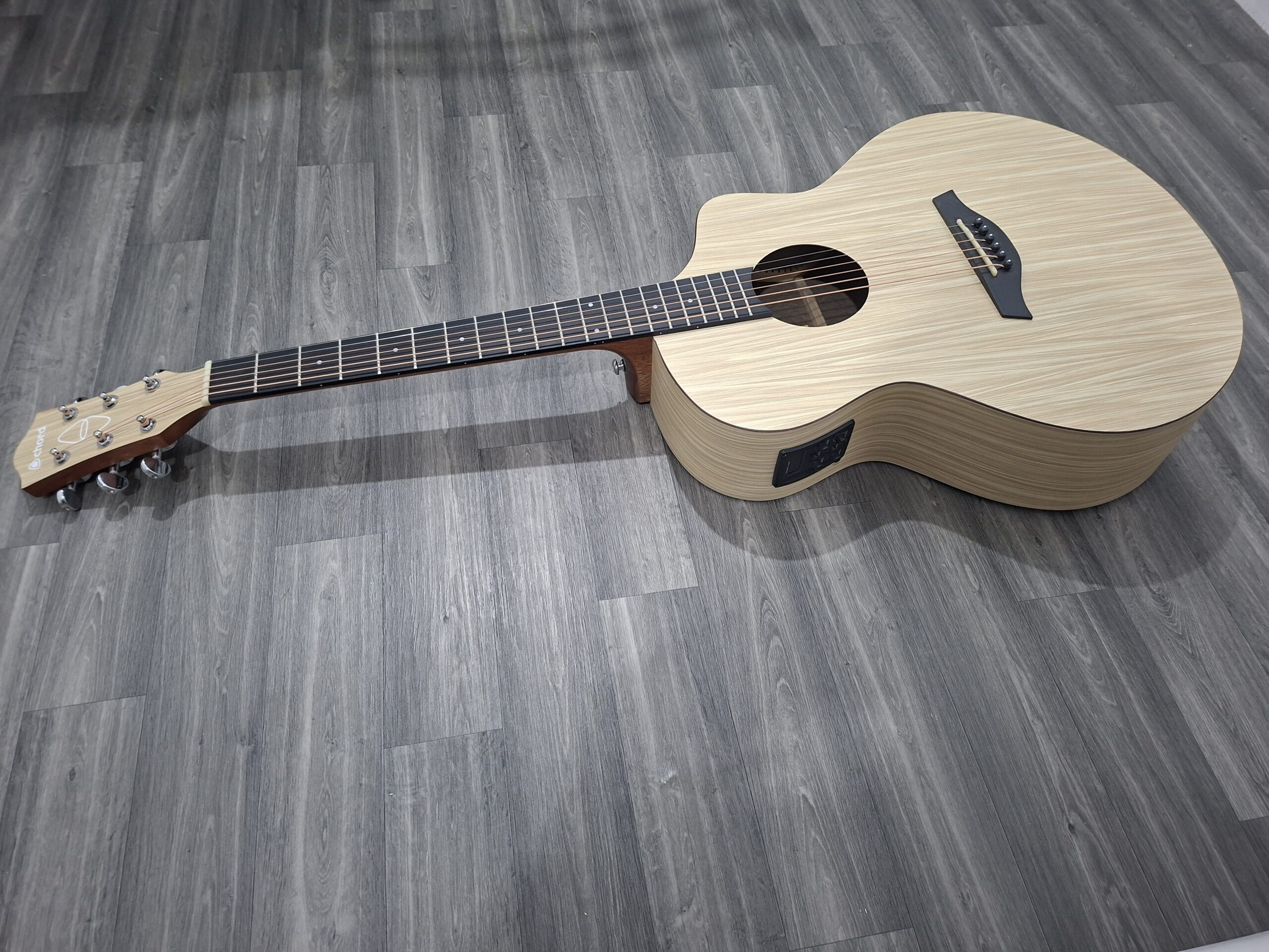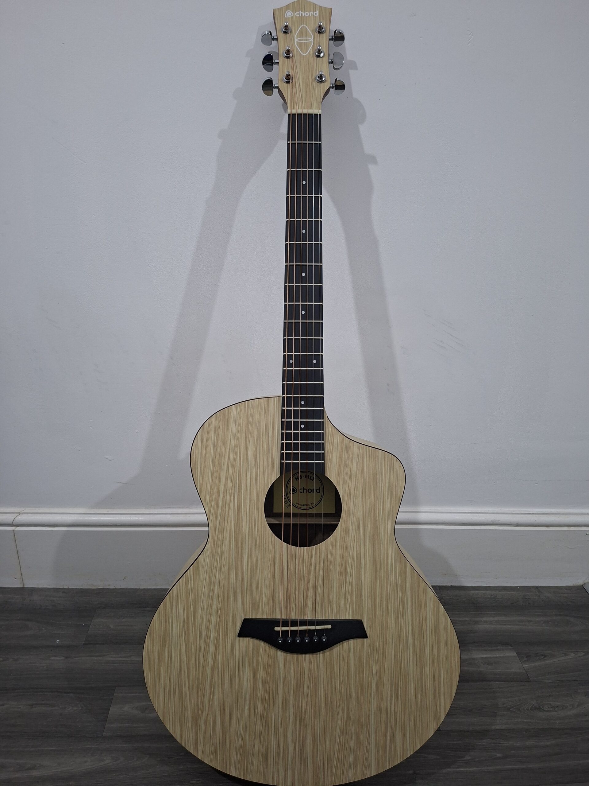 A modern chord nomad electro acoustic guitar with built in tuner and eq. Made from natural materials. The set up and tuning stability are excellent mainly because of what its made from, unlike hardwoods that are vulnerable to temperature and humidity changes. Aestetically pleasing with its modern and exotic woodgrain appearance.
