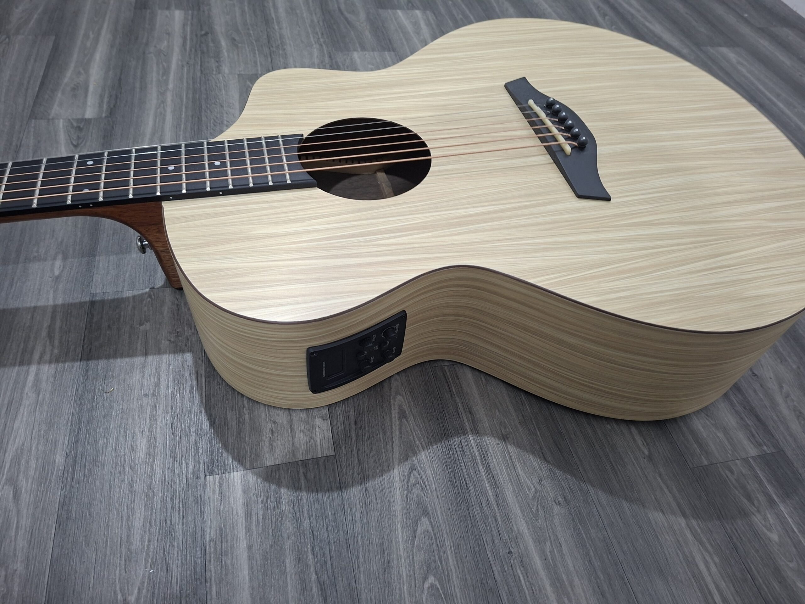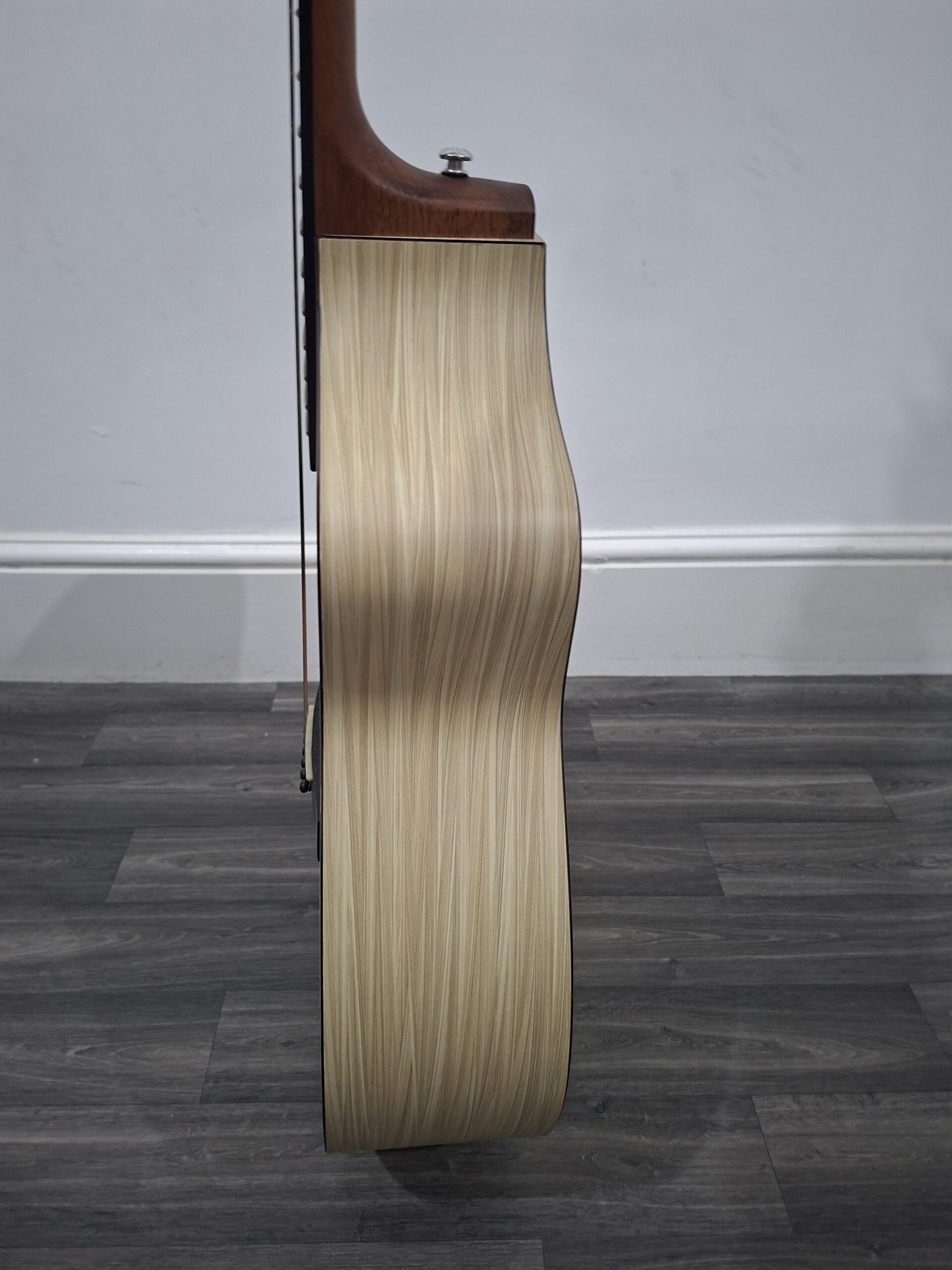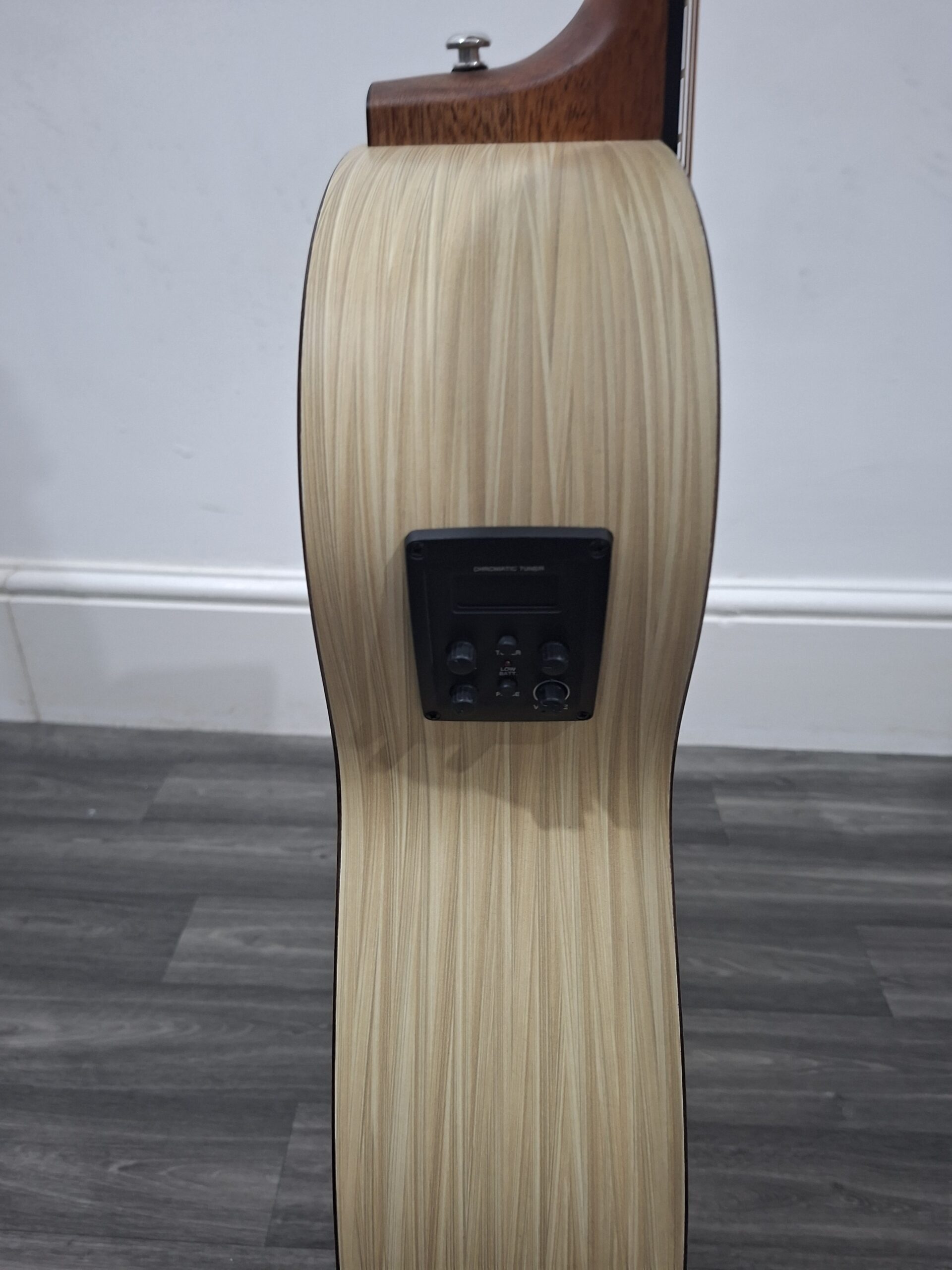 A modern chord nomad electro acoustic guitar with built in tuner and eq. Made from natural materials. The set up and tuning stability are excellent mainly because of what its made from, unlike hardwoods that are vulnerable to temperature and humidity changes. Aestetically pleasing with its modern and exotic woodgrain appearance.