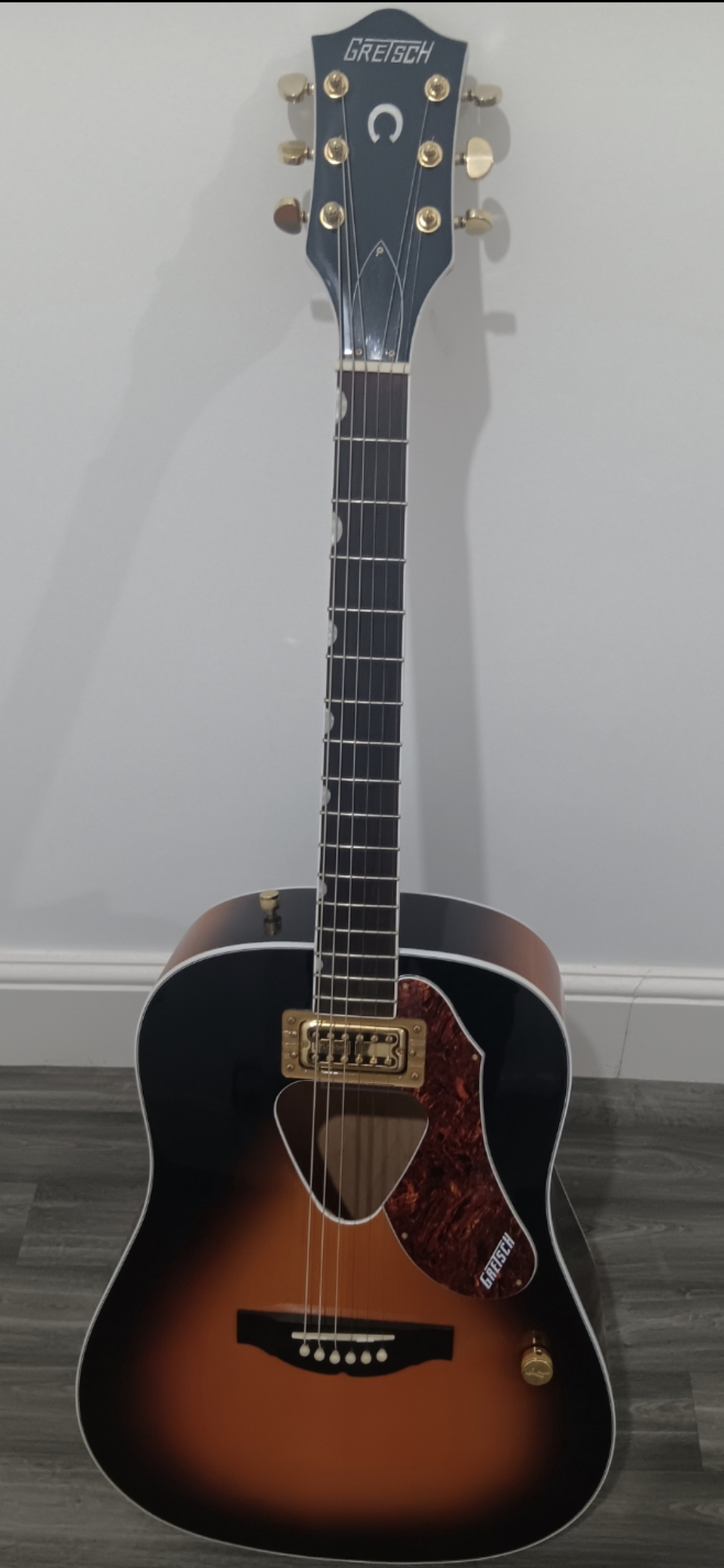 Gretsch rancher in excellent – like new condition. Fitted with warm mellow sounding fidelitron pickups, steel strings and a nice low action. Frets and fretboard in excellent – like new condition.